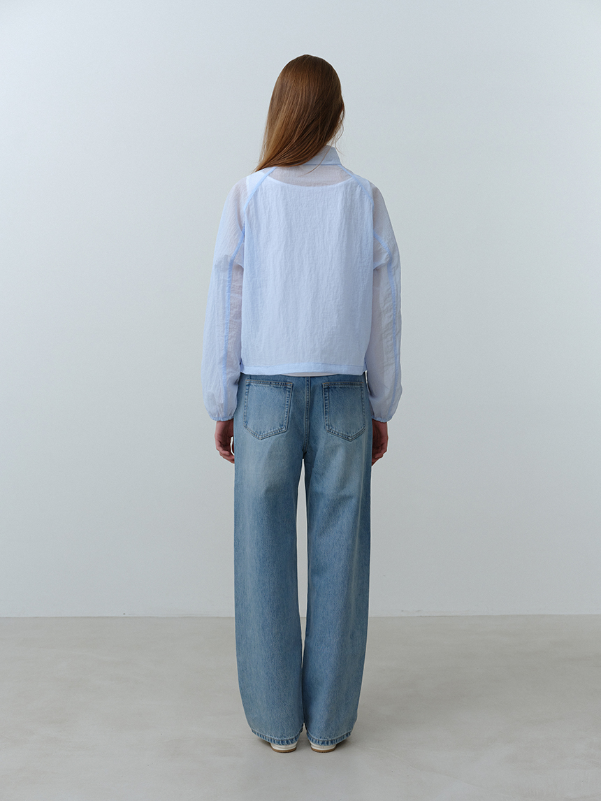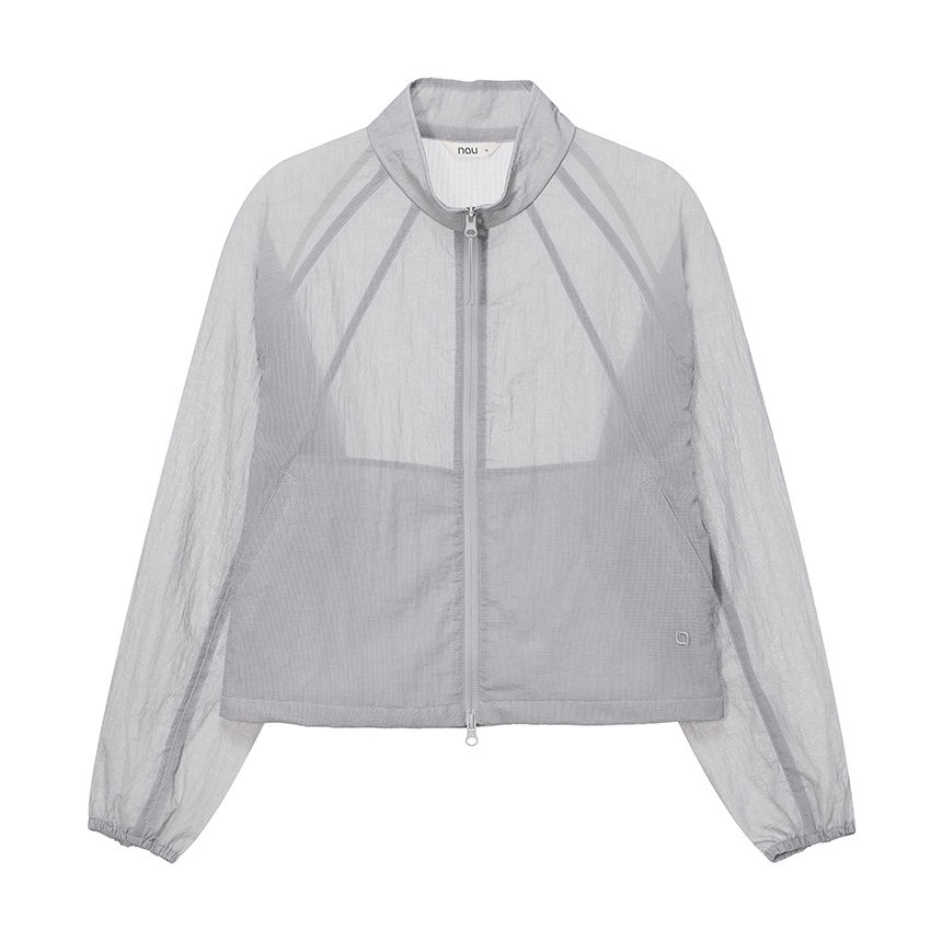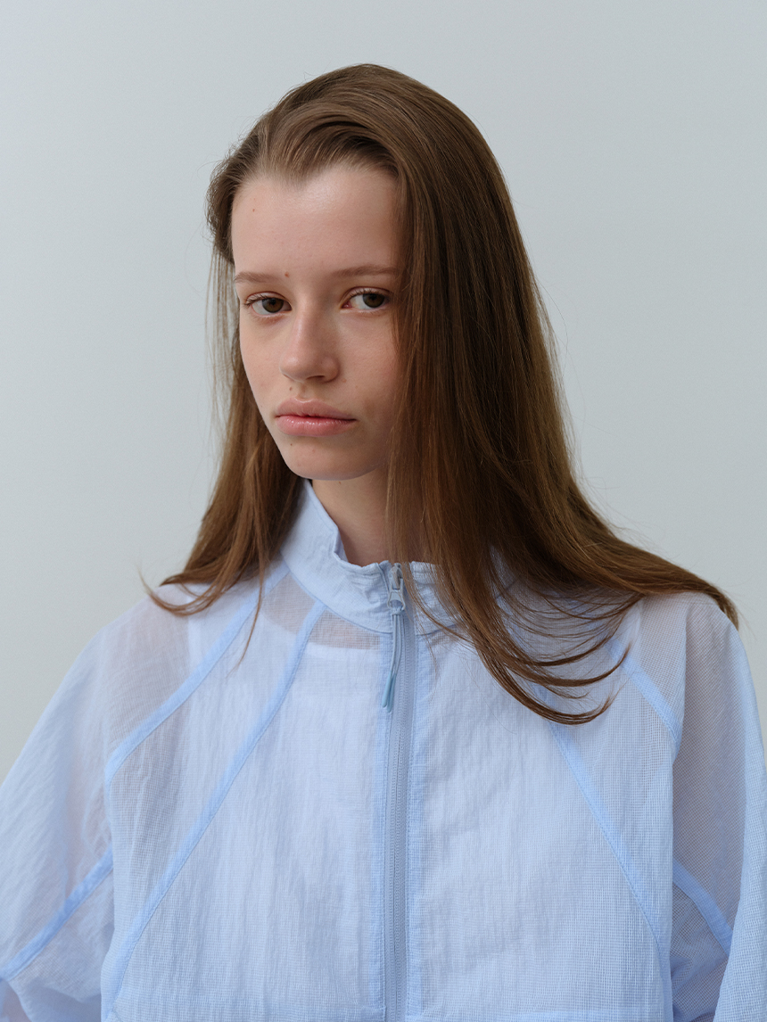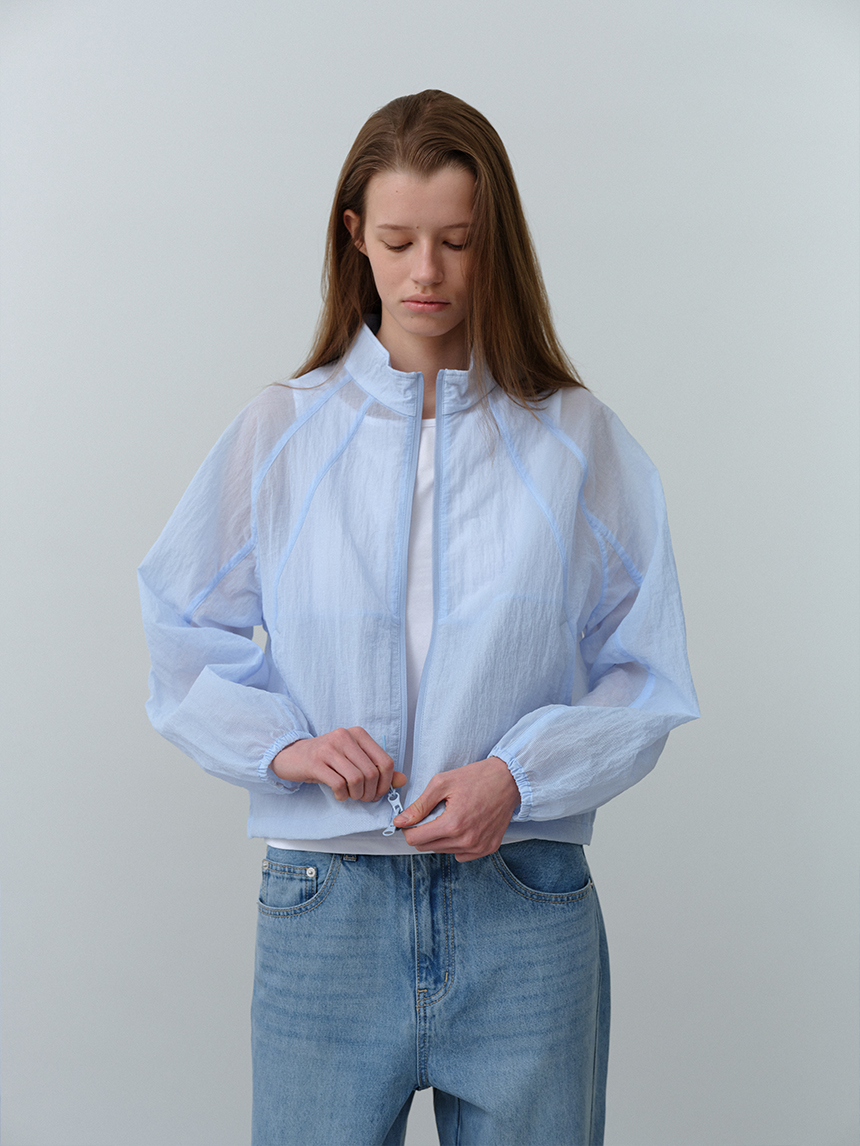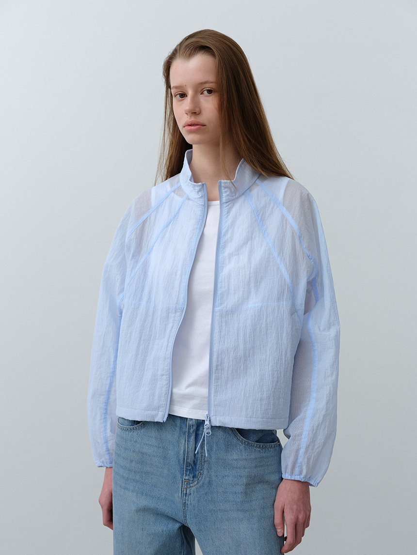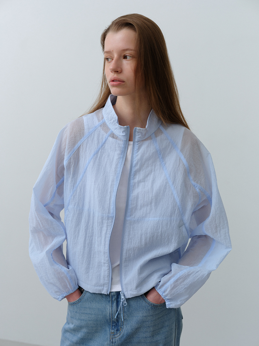 베일을 두른 듯 은은하게 비치는 시어 소재와 세미 루즈 핏이 어우러진 여성 하이넥 재킷입니다