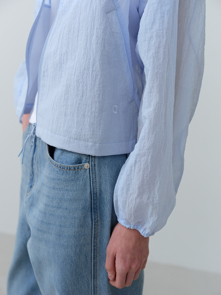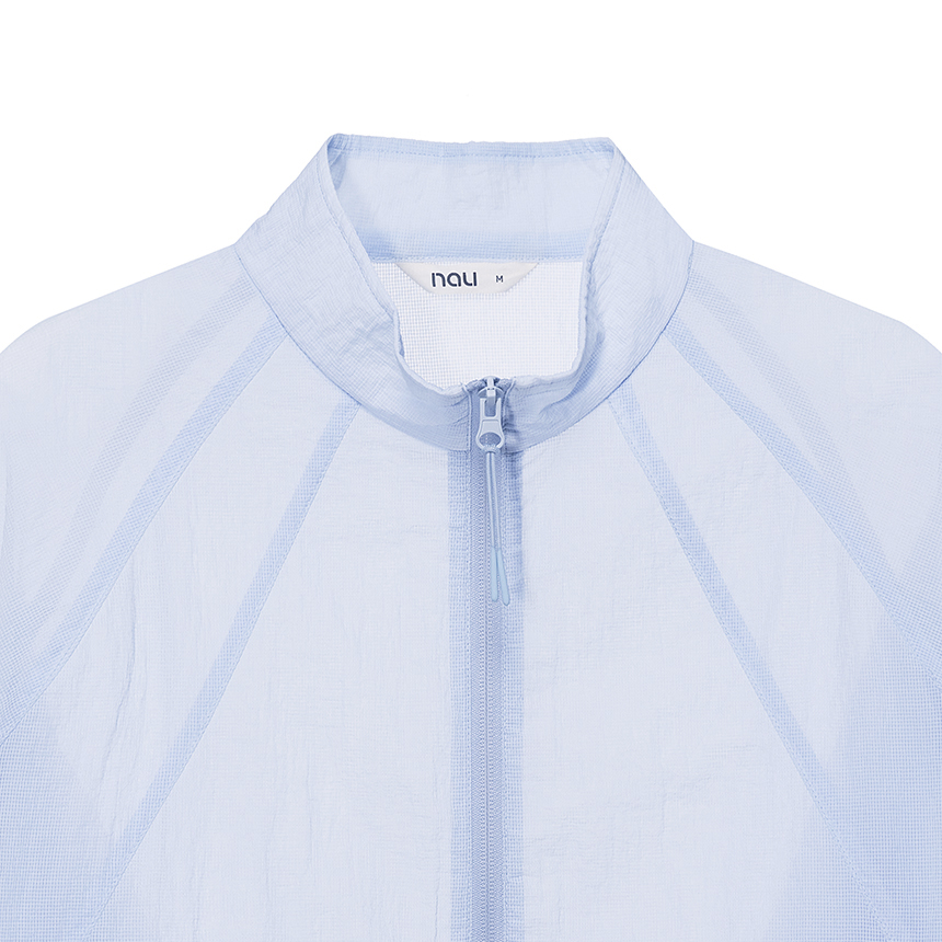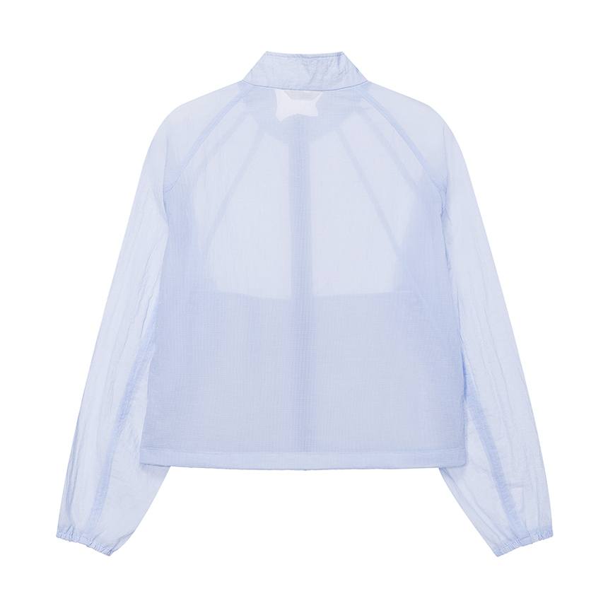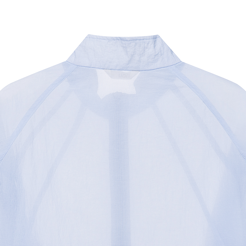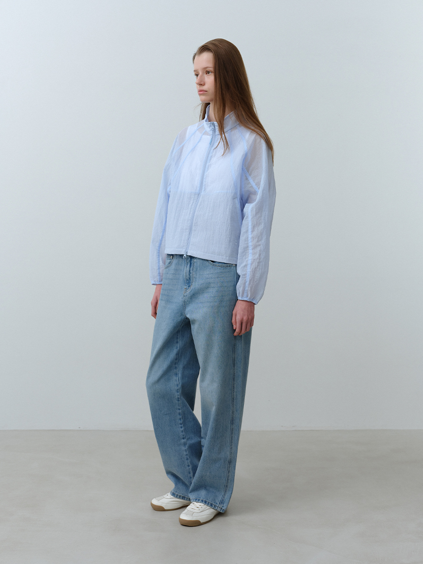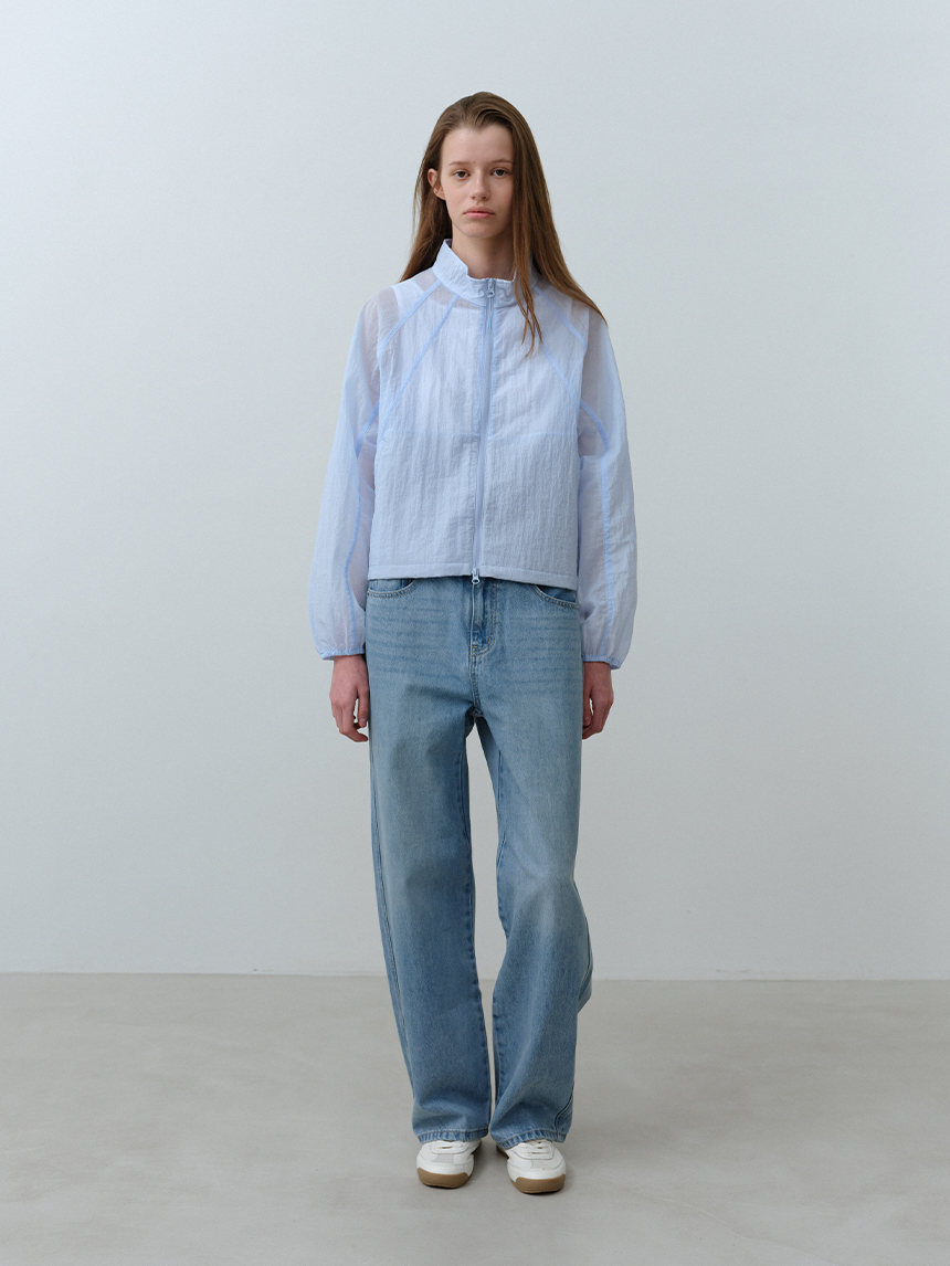 베일을 두른 듯 은은하게 비치는 시어 소재와 세미 루즈 핏이 어우러진 여성 하이넥 재킷입니다