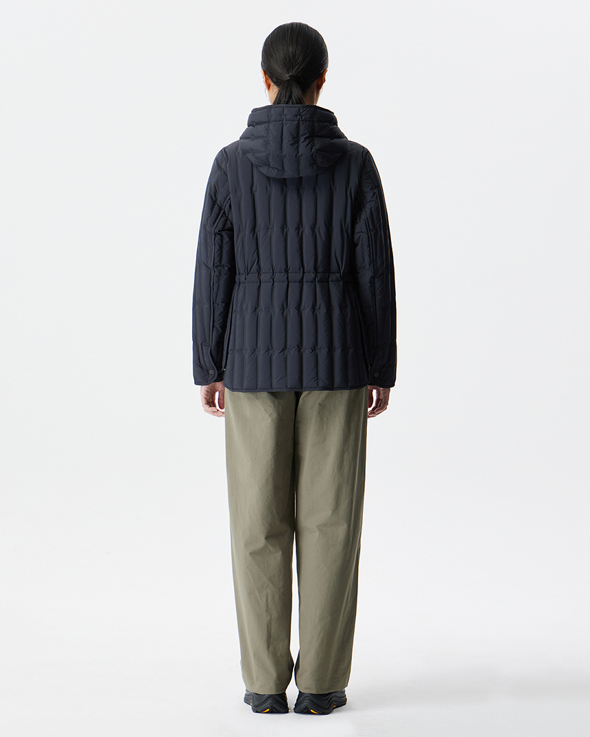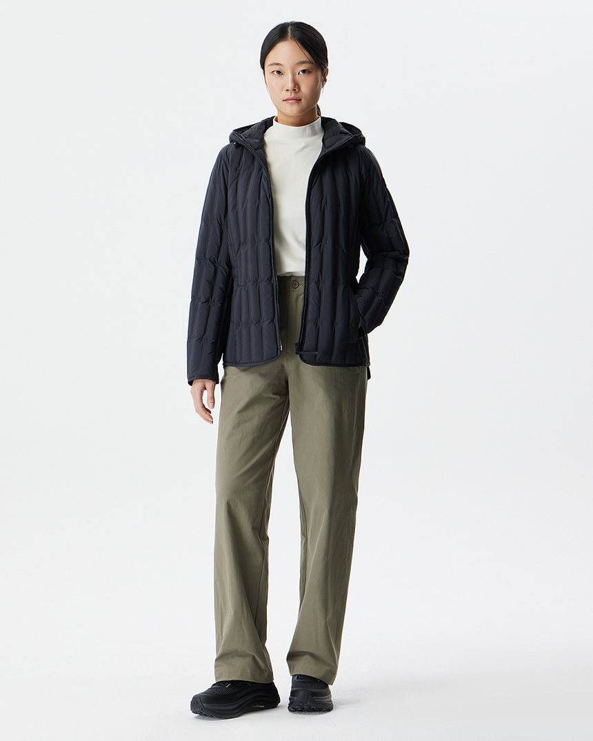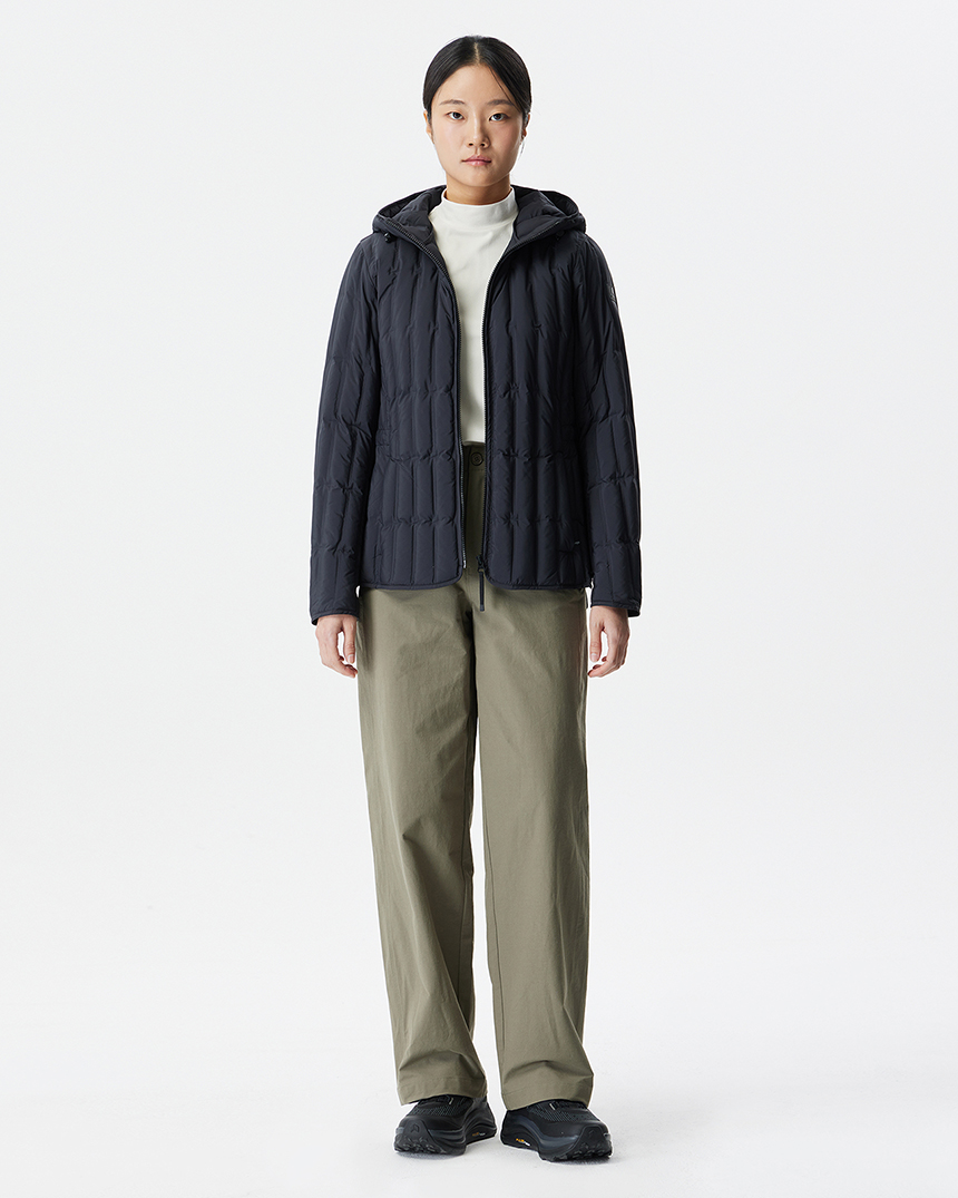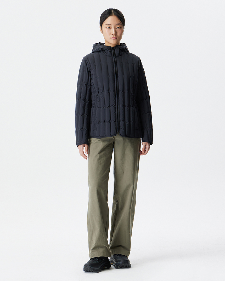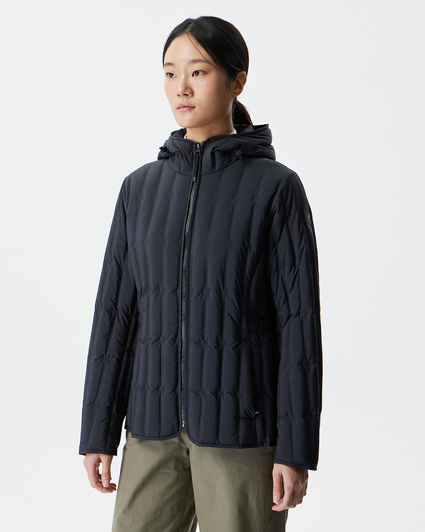 퀼팅 봉제선이 없는 튜브 패턴을 사용하여 봉제선에서 다운이 새어나오는 삼출 현상을 방지하여 보온성을 강화한 후드일체형 경량 다운입니다.
