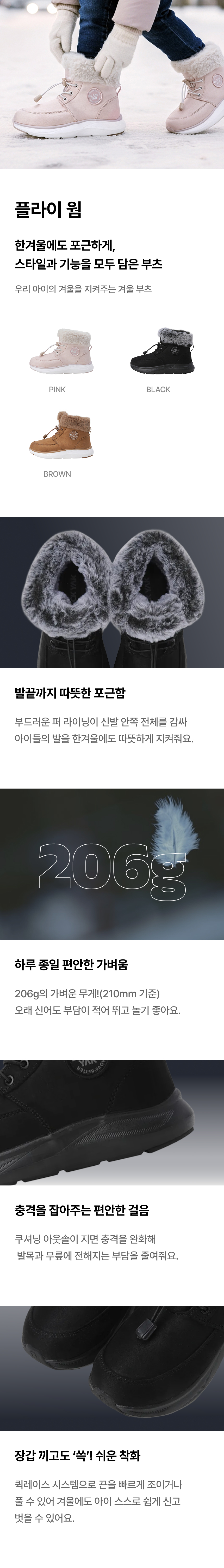 → 발을 부드럽게 감싸는 털: 내부 전체가 부드러운 소재로 라이닝되어, 한겨울에도 따뜻하게 발을 보호합니다.