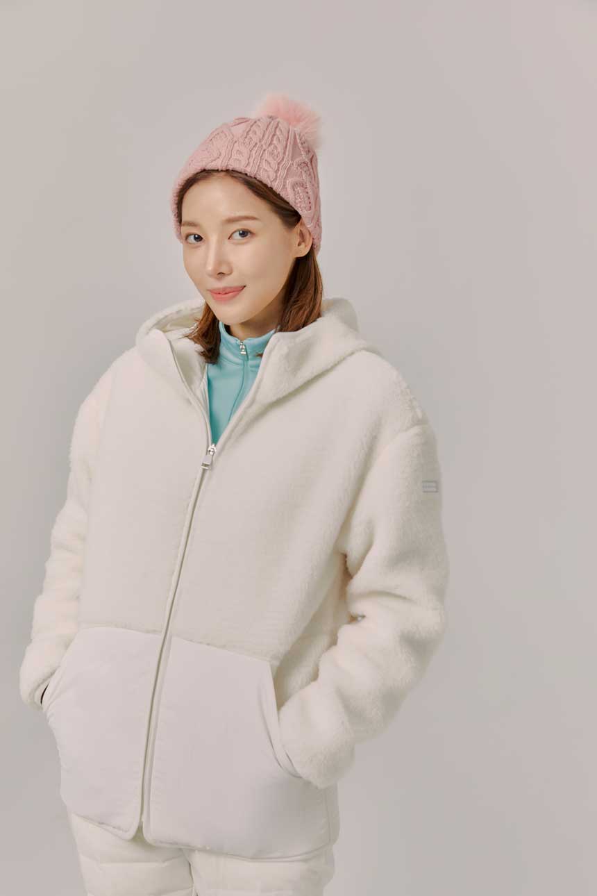 -앞판 원단 무봉제 퀼팅 소재를 사용하여 다운 빠지는 현상과 열손실을 방지하고, 뒷판은 신축성이 우수한 본딩 소재를 사용하여 활동성을 높임