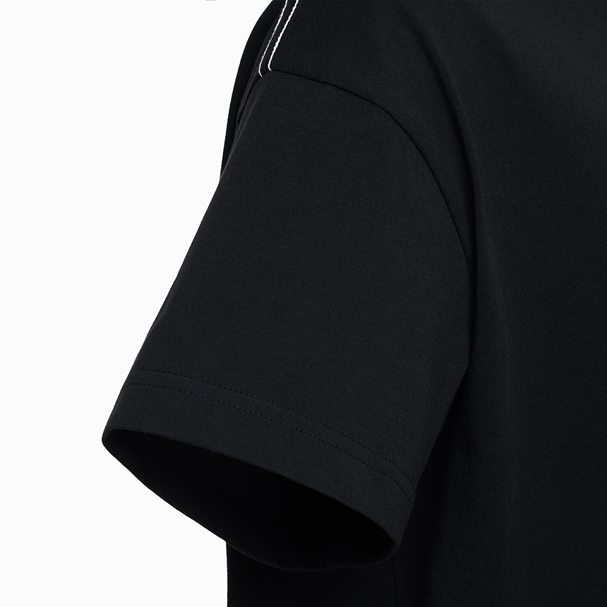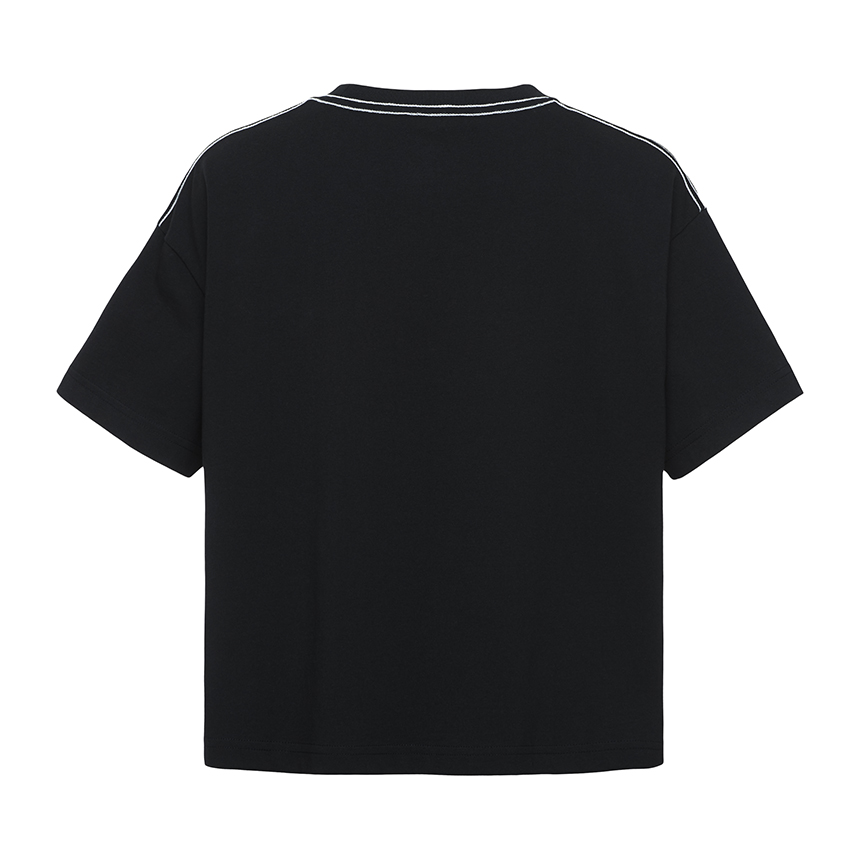 크롭 기장감을 적용하여 스타일리시한 연출이 가능한 반팔 티셔츠입니다.