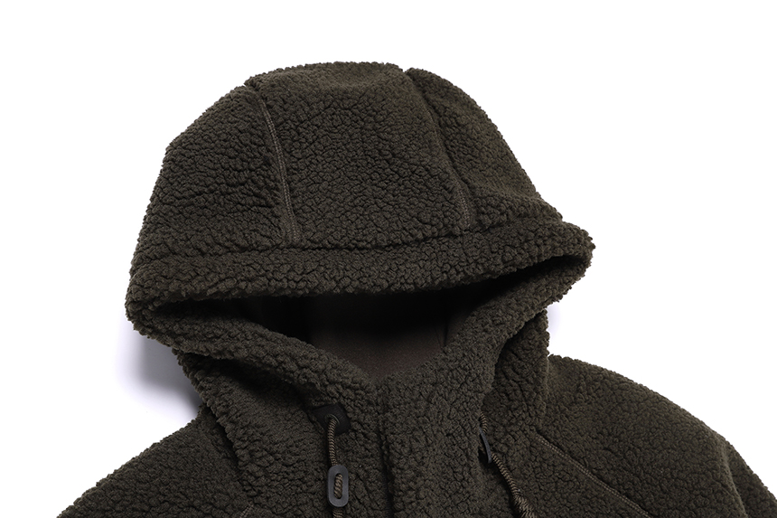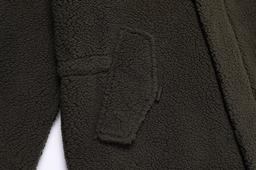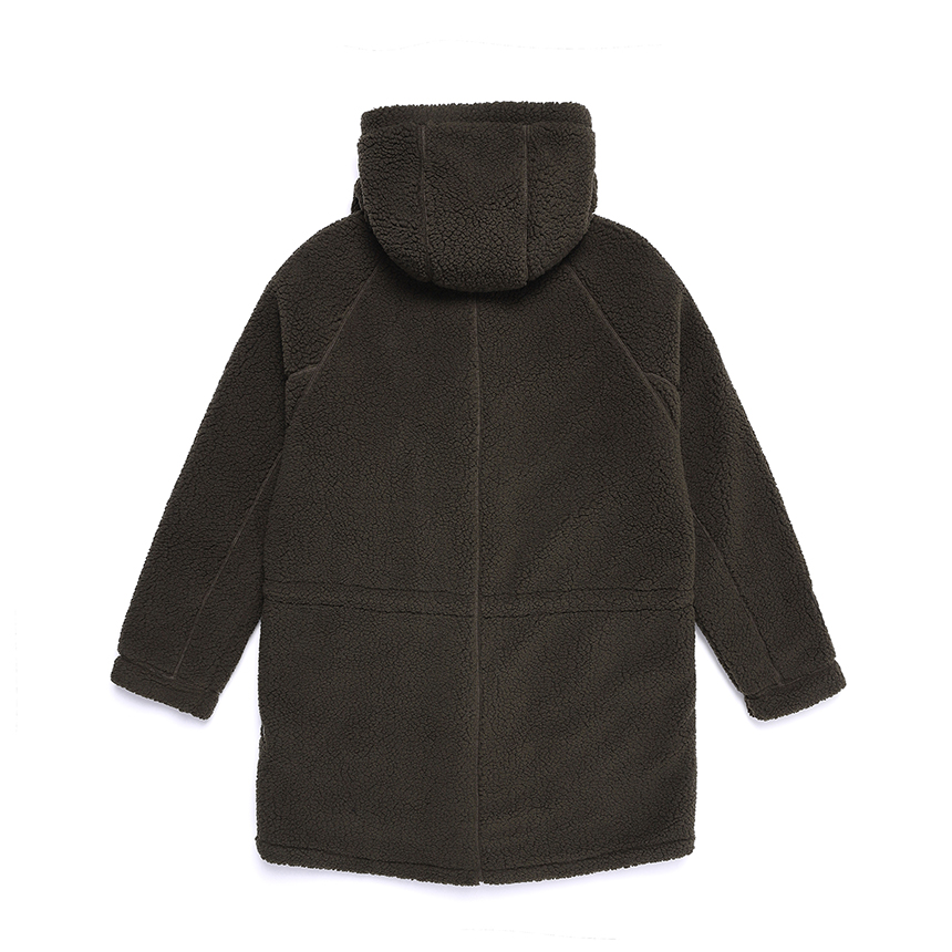 -디자인 : 뽀글이 플리스 소재와 전판에 패딩 퀼팅을 적용하여 보온성을 높인 제품이며, 스토퍼+스트링으로 조절이 가능한 후드 일체형 미들 기장 플리스 패딩 자켓