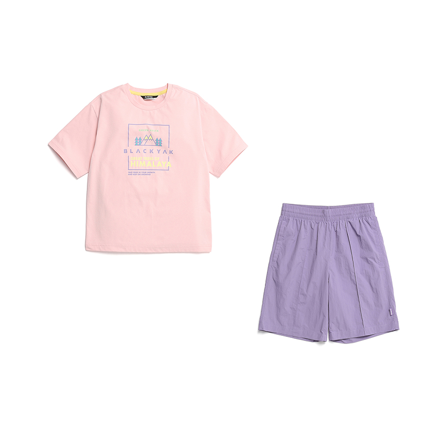 - 오버핏 '7부 티셔츠 + 우븐팬츠' 세트 구성 상품입니다.