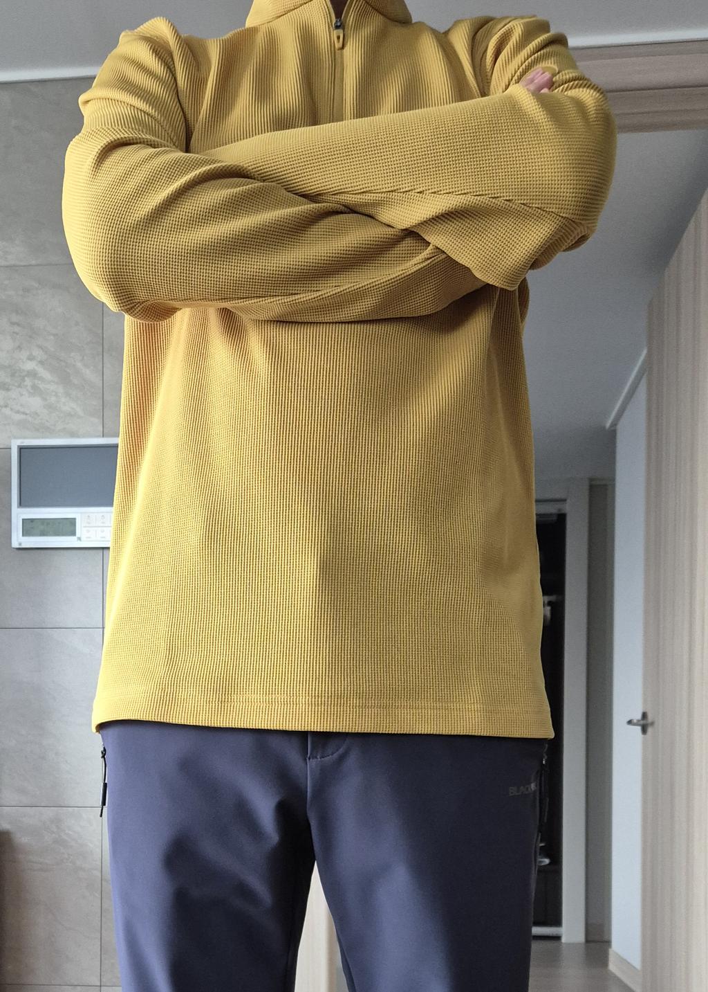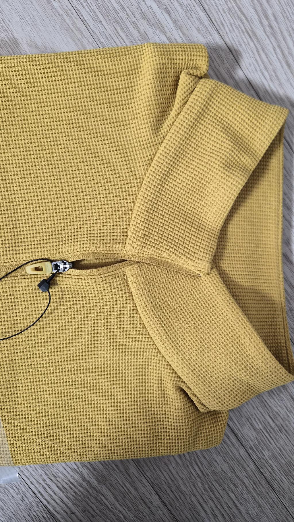 와플 니트 조직감이 돋보이는 남성용 집업 티셔츠입니다.