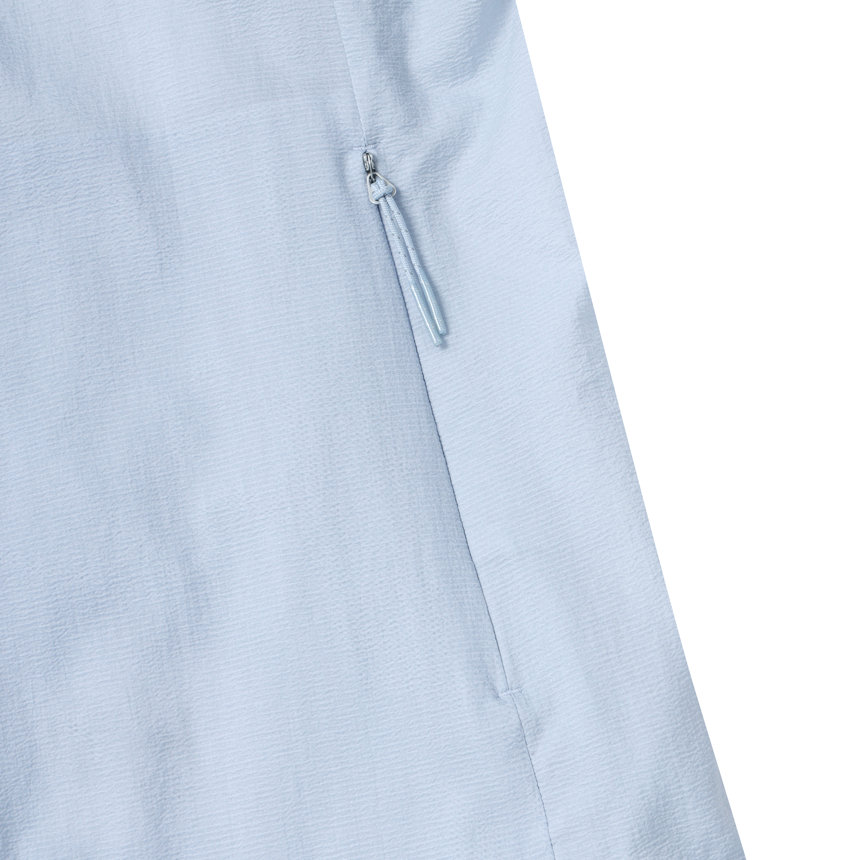 여름 시즌 여성용 에어 플라이 자켓#2은 초경량 홑겹 원단 사용, 요철감이 있어 몸에 달라붙지 않고 항상 쾌적하게 착장 가능한 기능성 원단 로 제작되어 뛰어난 기능을 자랑합니다. 심플한 스텐드넥 디자인, 측면 히든 포켓을 이용해 초소형 패커블 가능 PACK-ME 시스템 적용 디자인으로 스타일과 실용성을 겸비했으며, 아웃도어 본질의 초경량 패커블 바람막이, 리싸이클 원단 사용
