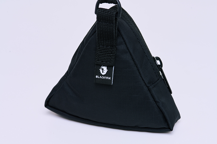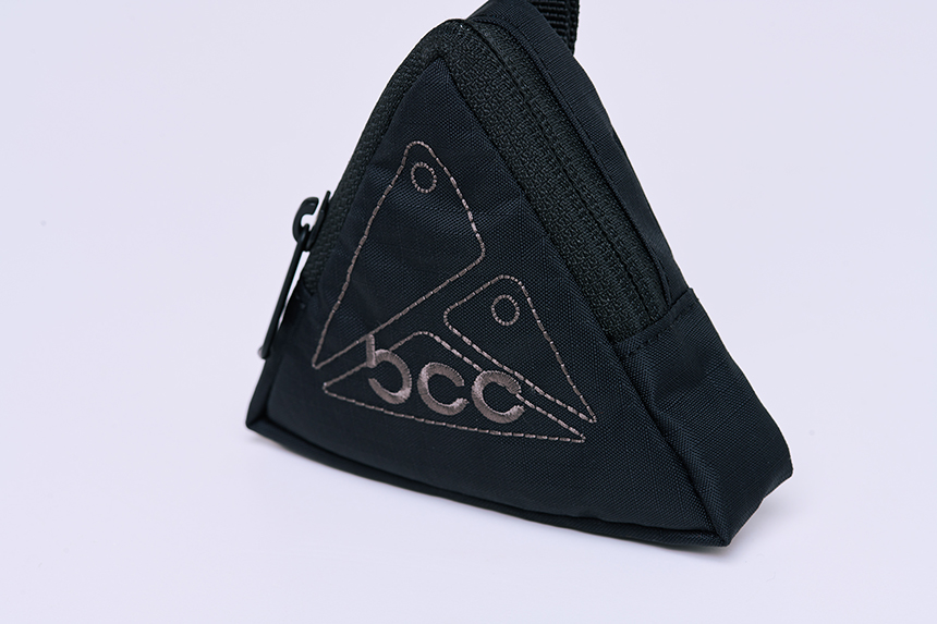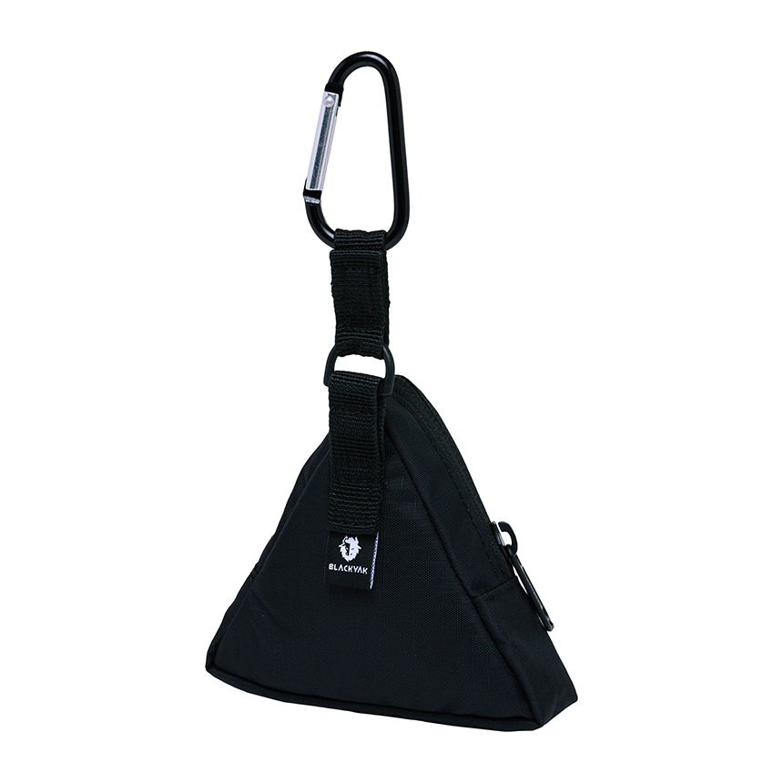 정면의 그래픽 자수가 포인트인 삼각형 파우치입니다.