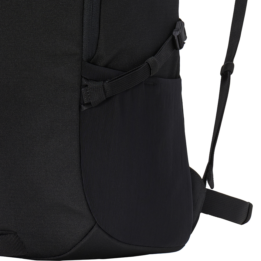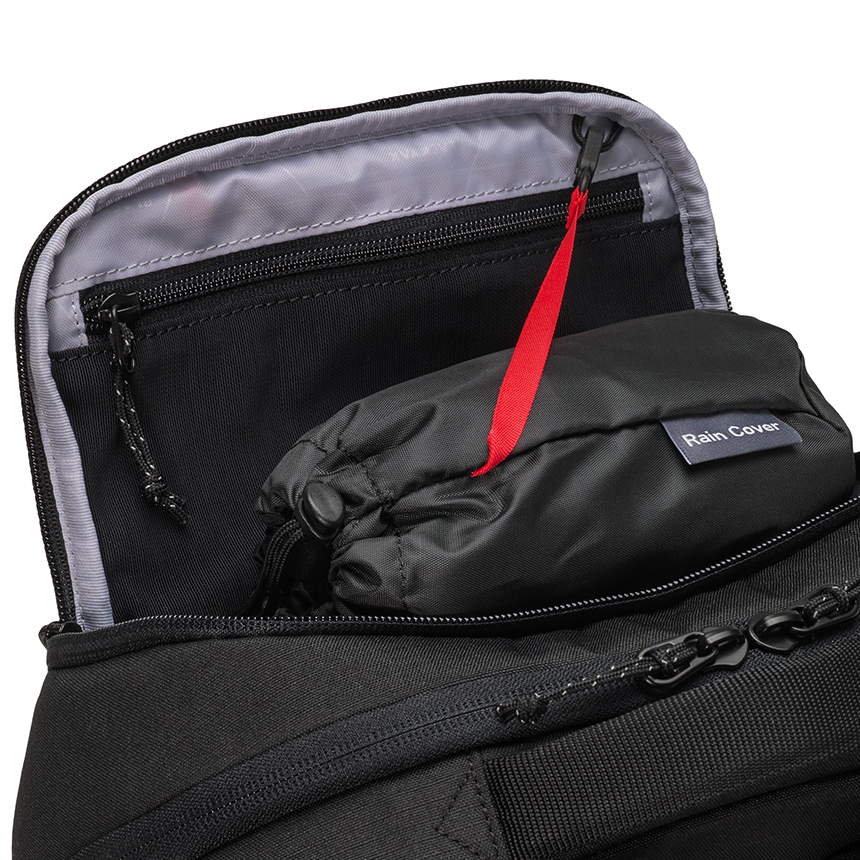 상단과 양쪽 사이드에는 보조 포켓이 있어 물병이나 간단한 소지품 수납이 가능하고, 상단 포켓 안에는 레인커버가 포함되어 있어 날씨 변화에도 대응할 수 있습니다.