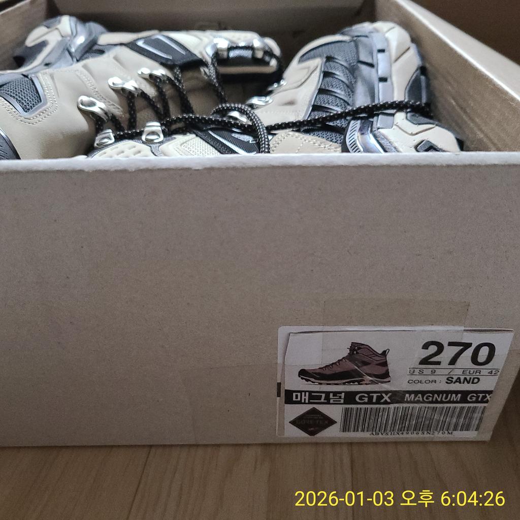 | 소재 | [겉감] 소재-1 천연가죽(소가죽), 소재-2-폴리에스터 85% 폴리우레탄 15%, 소재-3-폴리에스터100% [안감] 소재-1 나일론 70%, 폴리에스터 30%(고어텍스), 소재-2 폴리에스터 100% [창] 합성수지(EVA), 합성고무 |